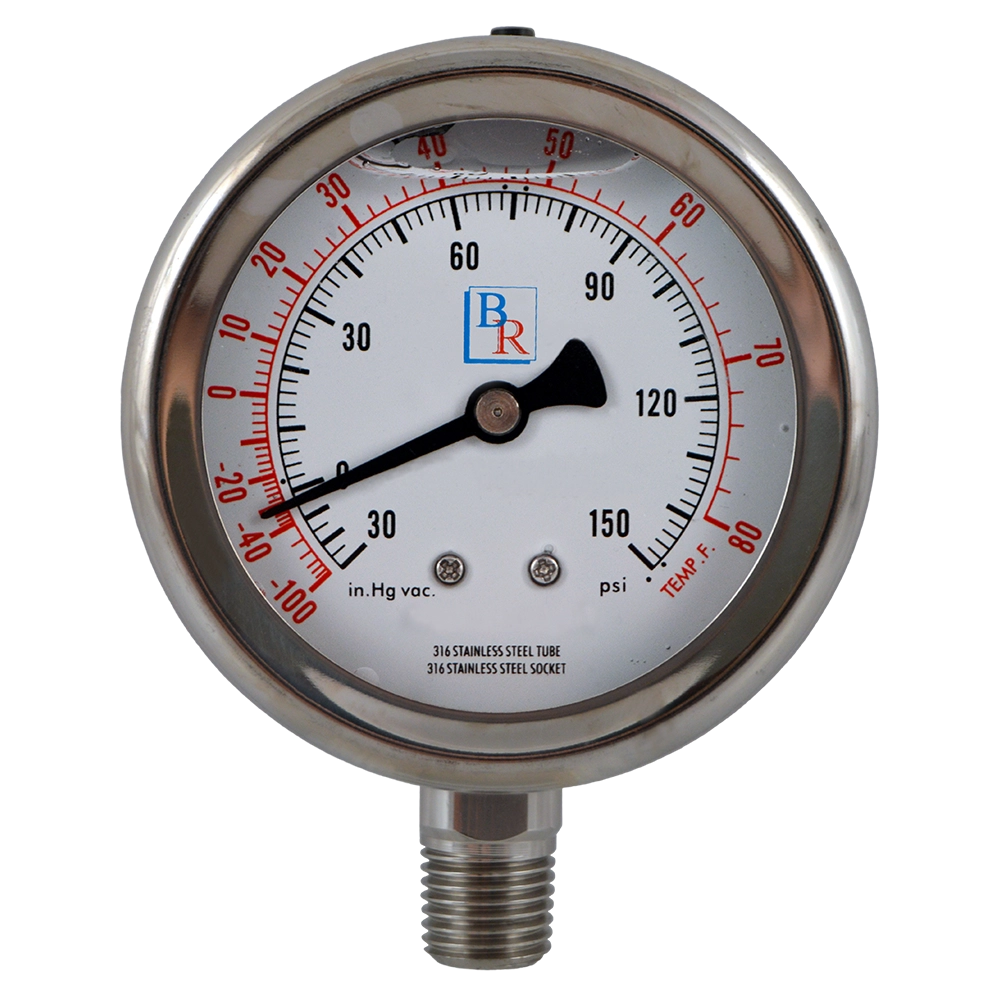 Model BR250L Stainless Steel Liquid Filled Gauges from Blue Ribbon Corp is a high quality line of liquid filled gauges. Its crimped, welded stainless steel bezel and glycerine fill is designed for gas or liquid applications that require damping.