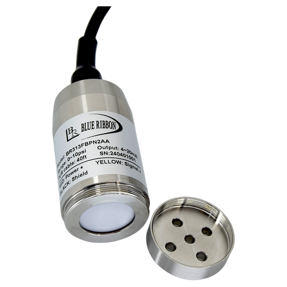 Model BR313F Flush Submersible Level Transmitter utilizes a flush 1.06” flush ceramic diaphragm that inhibits grease and biosolid buildup typically found in water treatment level applications. This flush ceramic design saves cost by eliminating sensor clean-out found with many other non flush designs. The corrosion-resistant 304SS construction, and an integrated hydrophobic breather vent help provide years of maintenance-free service.