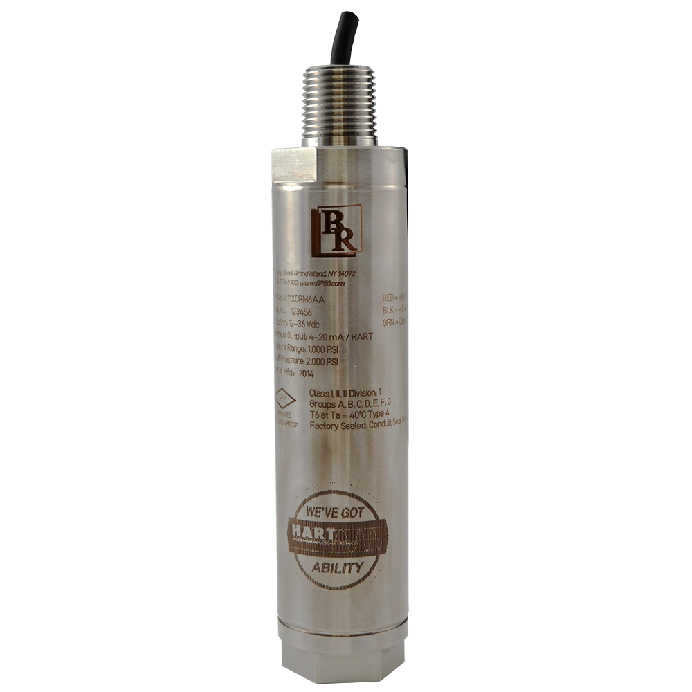 Model BR411, 411XP Smart Rangeable Hazardous Location Pressure Transmitter is a SMART rangeable pressure transmitter incorporating a 4-20 mA output with digital HART protocol. Units are offered with both CSA and FM approval options, as well as a variety of process and electrical connections. Improved accuracy provides for a stable measurement throughout the total compensated temperature range.