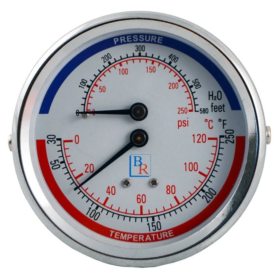 Model BRPT Boiler Gauge/Tridicator from Blue Ribbon Corp is a family of high-accuracy tridicators. A tridicator is a dual purpose instrument that reads both temperature and pressure levels on the same dial face using an independent pointer and scale. This instrument, also known as a “Boiler Gauge,” is used primarily on heating systems and boilers.